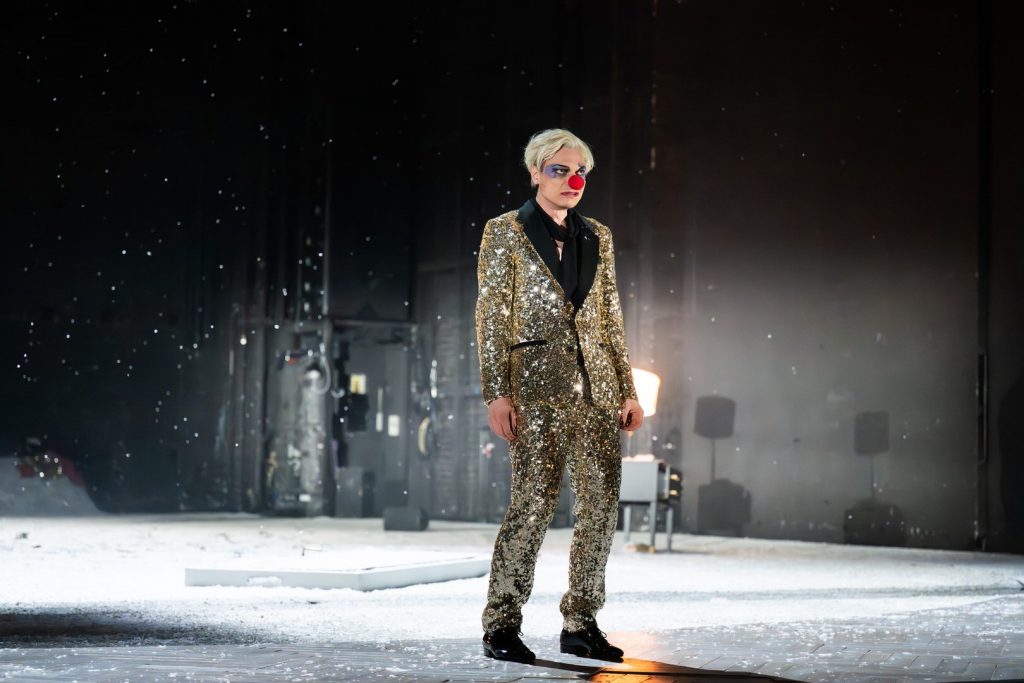 Claus Guth, der üblicherweise an den großen Opernhäusern inszeniert und hier mit dem Musical-Klassiker einen Ausflug ans Bayerische Staatsschauspiel macht, betont in seiner Inszenierung das Düstere und den bevorstehenden Untergang der Weimarer Republik. Nach der Pause wird der Conférencier mit Clownsnase zur unberechenbaren Joker-Figur, jeder Glitzer und Glamour weicht der rauen Betonwand auf der leergeräumten Bühne.