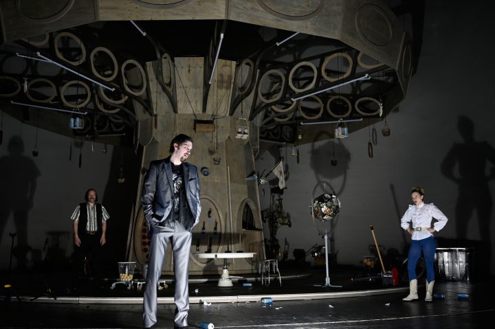 Die Inszenierung von Jan Bosse plätschert hingegen betulich. Jenseits des raumfüllenden Karusells (Bühne: Stéphane Laimé) und der spleenigen Kostüme (Katrin Plath) bietet der Abend noch Songs von Carolina Bigge, die sich das Ensemble in Solo-Auftritten aufteilt und am Schlagwerk begleitet. Mit fast drei Stunden zieht sich die Kleinstadt-Farce allerdings allzu sehr in die Länge. Für die große Bühne ist dieser Abend zu leichtgewichtig. Sinnvoller wäre eine gekürzte Fassung für die Kammerbühne.